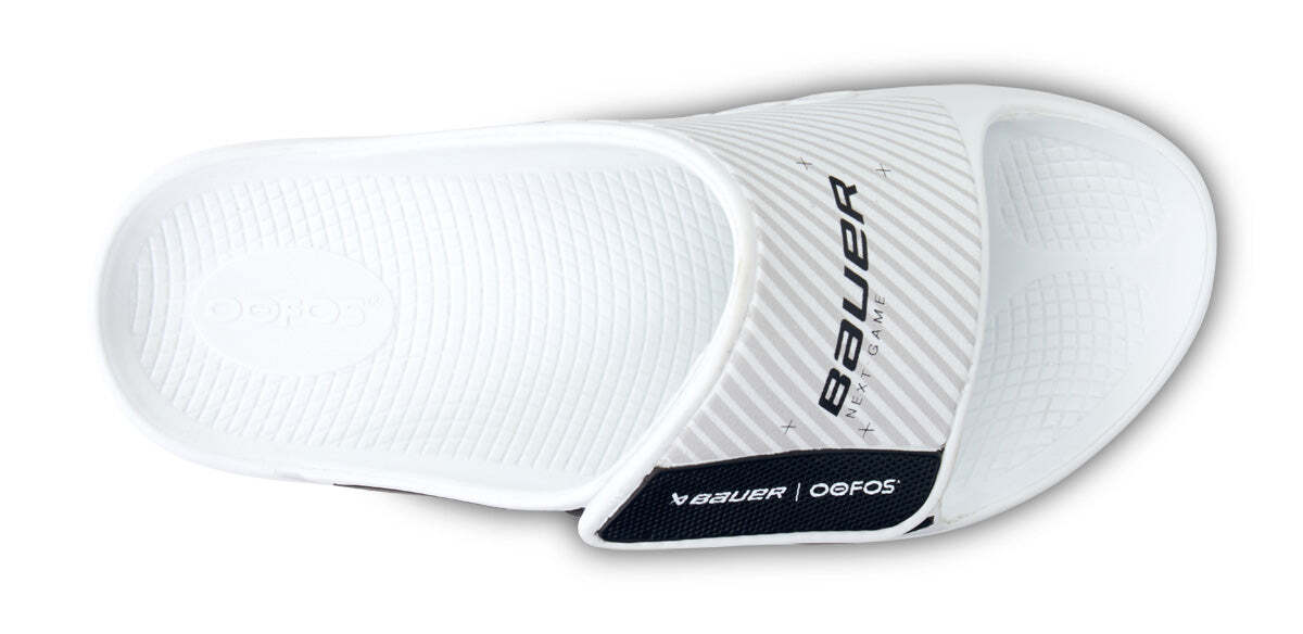 slide collection by Bauer feature s OOFOS proprietary OOfoam technology, which absorbs imp act on a player’s foot, ankle and body. Combined with a patented